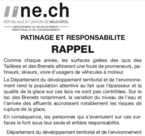 IMPORTANT : l’épaisseur et la qualité de la glace ne sont pas contrôlées. Les usagers du lac gelé s’y déplacent sous leur entière et unique responsabilité.